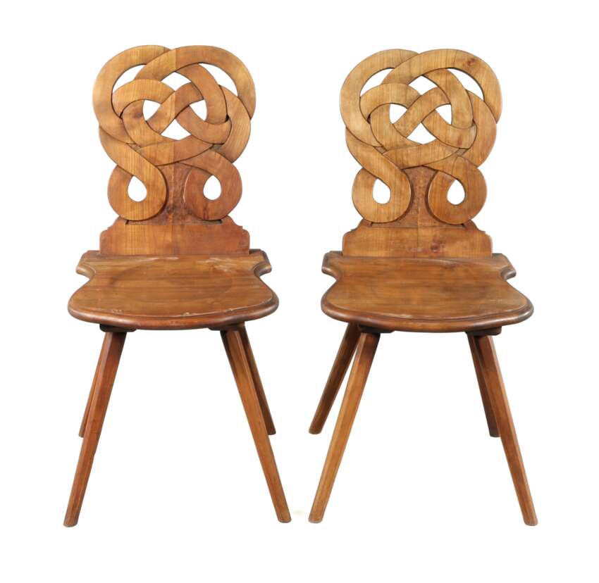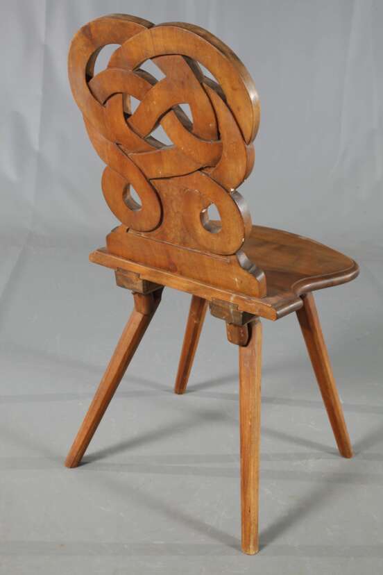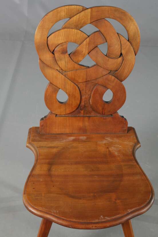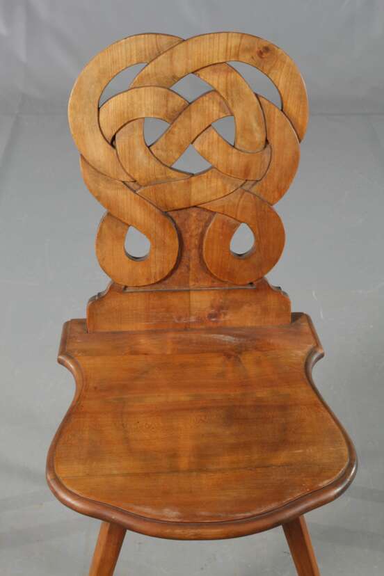 Süddeutschland, 19. Jh., Kirschbaum massiv, die Lehne mit geschnitztem Endlosband, gemuldete Sitzfläche, auf schräg ausgestellten Achtkantbeinen, H 87 cm, SH 44 cm.