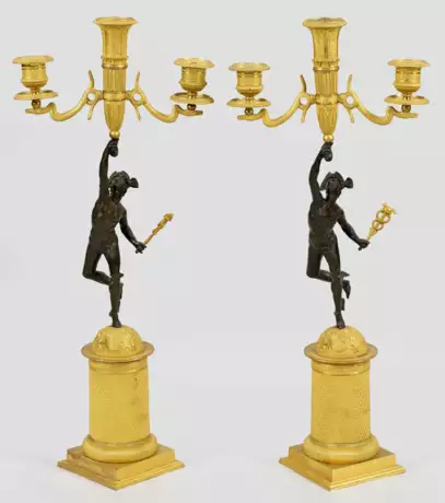 3-flg.; Bronze, feuervergoldet und teilw. dunkel patiniert. Über quadratischer Plinthe flächendeckend reliefierter Schaft mit zartem Blattfries sowie gewölbter Sockel mit erhaben reliefierten Füllhörnern. Oberhalb vollplastische Darstellung des Götterboten Hermes als Träger für Leuchtmittel aus zentralem Köchermotiv mit geschwungenen Leuchterarmen in Form von fein reliefierten Schwanenhälsen mit vasenförmigen Tüllen. H. 52 cm.