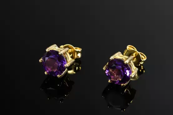 Pair of 585 yellow gold stud earrings with colourful amethysts in prong settings, 2.7g, Ø 8mm