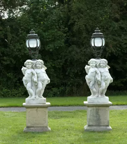 1-flg.; Weißer, teilw. hellgrau gemaserter Marmor, patinierte Bronze, satiniertes Glas und Gussstein. Über quadratischer Plinthe drei um einen Säulenschaft gruppierte, vollplastisch gestaltete Amoretten mit Weinreben sowie üppig gefüllten Traubenkörben. Oberhalb balusterförmige Laterne aus schmalen, gegeneinander gestellten Voluten und stark bombierten Glaseinsätzen. Gestuft ansteigender oberer Dachabschluss mit Balusterbekrönung. Elektrifiziert. Unterhalb hoher Podestsockel mit profilierter Basis, flach kassettierten Füllungen sowie korrespondierender Deckplatte. Ges.-H. 255 cm.
