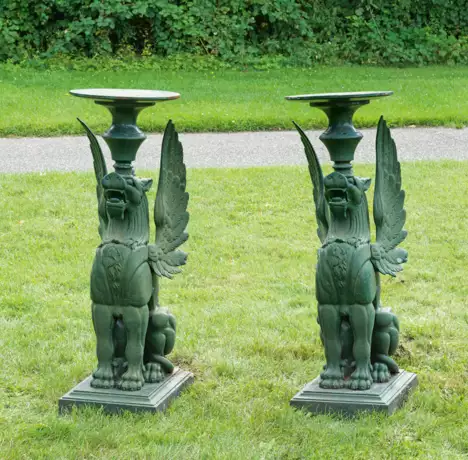 Gusseisen, dunkelgrün lackiert. Über rechteckiger, umlaufend gekehlter Plinthe vollplastisch ausgeführte und stilisiert dargestellte, sitzende, geflügelte Löwenskulpturen als Wächterfiguren, einen kräftigen, mehrfach gegliederten Balusterschaft auf ihrem Kopf balancierend. Oberhalb flache, runde Deckplatte als Abstellfläche. Sockel bez. Salin France. H. 118 cm. D. 40 cm.