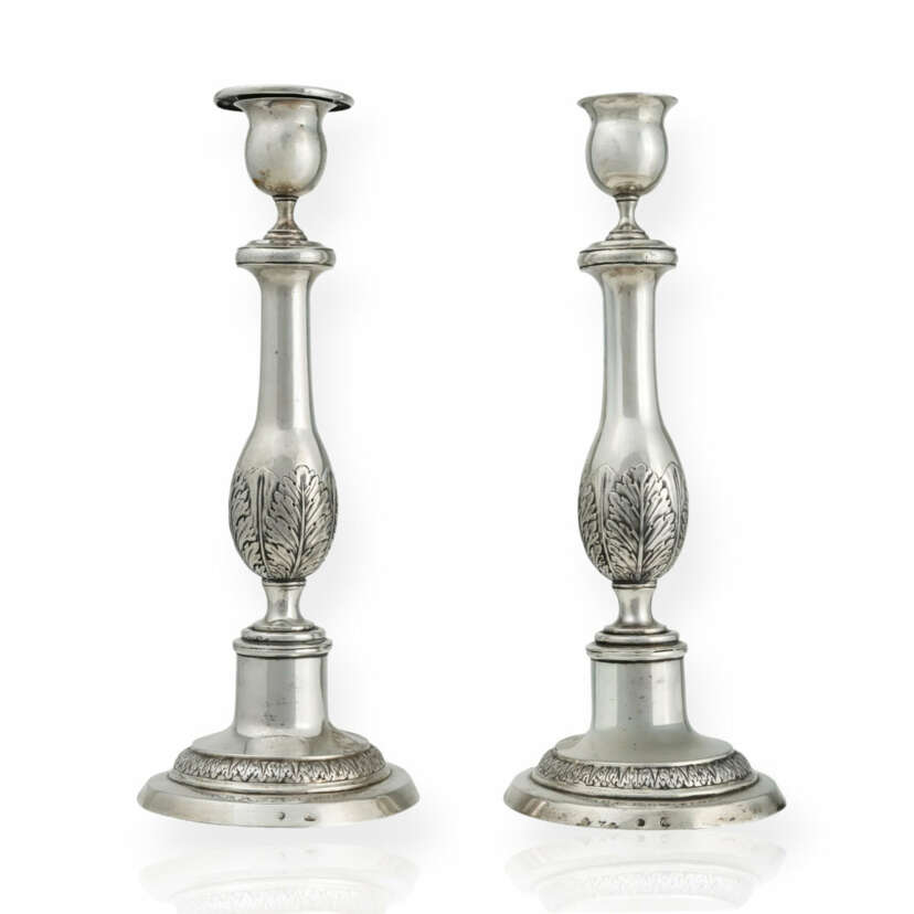 2 pieces, Germany, manufacturer's mark CA, early 19th century, fineness 12-solder silver (750), hallmarked, classicist form, relief and chiselled leaf friezes above round plinth, height approx. 31 cm, mounted, hollow filled, total weight approx. 875 g, dents, signs of polishing and wear, one spout missing