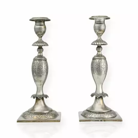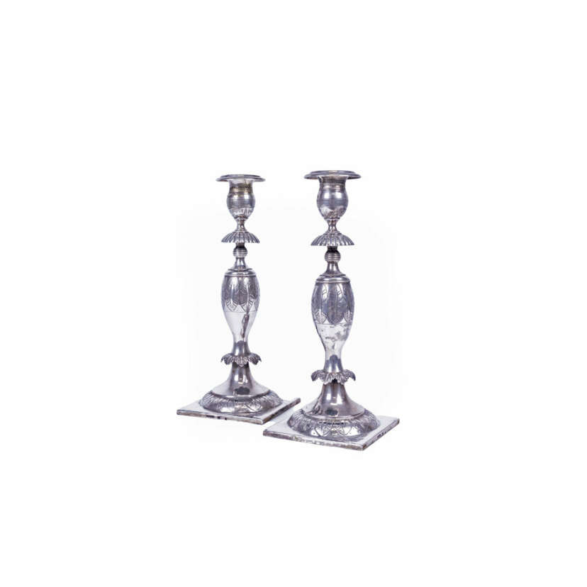 2 pieces, Germany, early 19th century, fineness 12-solder silver (750), hallmarked, maker's mark Alram, classicist form, relief and chiselled leaf friezes above the square plinth, height 29 cm, hollow, total weight approx. 884 g, with signs of polishing and wear