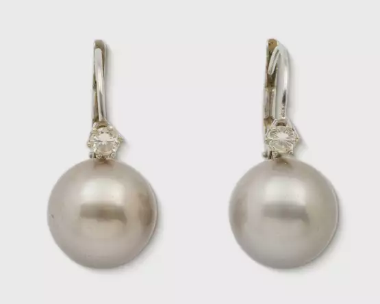 Weißgold, gest. 585. 2 makellose silbergraue Tahitiperlen von ca. 11,5 mm, bekrönt von 2 Brillanten von zus. ca. 0,20 ct.; Ges.-Gew. ca. 6,27 g.