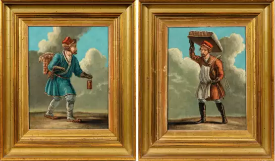 Paar Gemälde mit jeweils einem Mann in ländlicher Kleidung mit Korb, zum Transport seiner Waren vor tiefem Horizont mit lebhaften Wolken. Nach Alexander Orlowski (1777 - 1832). Minim. rest.; Polychrome Lackmalerei. 16,5 cm x 22 cm. Rahmen 28 cm x 33 cm.