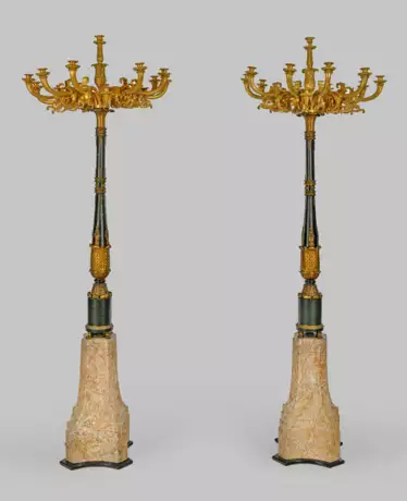 16-flg.; In unterschiedlichen Beigetönen gemaserter Marmor sowie Bronze, vergoldet und teilw. patiniert. Über konkav eingezogener, sich konisch verjüngender Basis mehrfach gegliederter Balusterschaft mit großen, reliefplastischen Lanzettblättern auf plastischen Tatzenfüßen. Oberhalb davon ausgehend Girandolenelement aus stark geschwungenen, gestuft angeordneten Leuchterarmen in Form von Voluten als Träger für Leuchtmittel. H. 233 cm.
