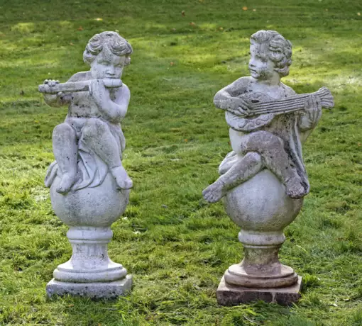 Steinguss. Zwei vollplastisch gestaltete Putten mit lockigem Haar, musizierend auf Querflöte und Laute, sitzend auf Kugelsockeln mit profiliertem Schaft und quadratischer Bodenplatte. Ges.-H. ca. 100 cm.