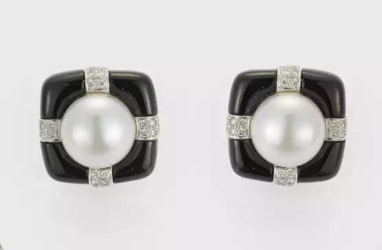 Weißgold, gest. 750. Zentral besetzt mit 2 schneeweißen Südsee-Perlen von ca. 13 mm mit farbintensivem, roségrün changierendem Lüster, entouriert von Onyx und kleinen Brillanten. Ges.-Gew. ca. 22,71 g.