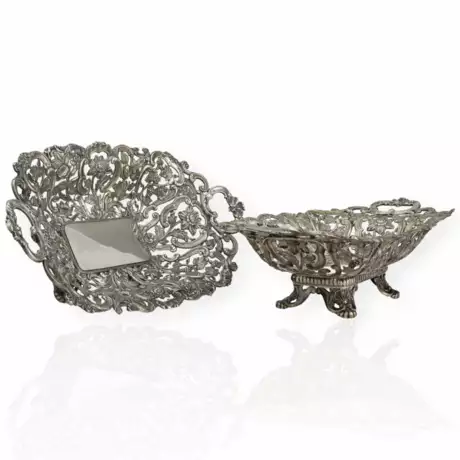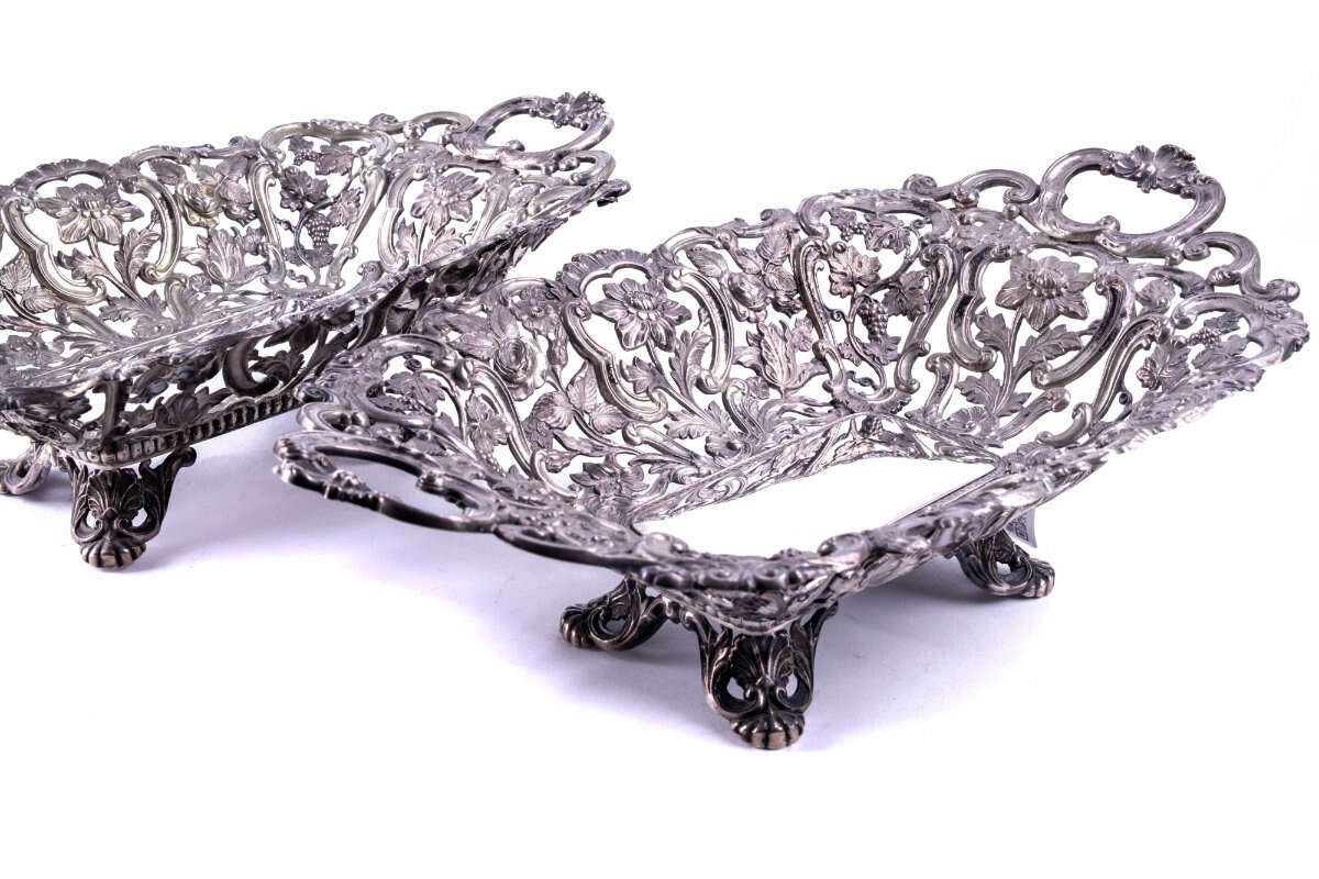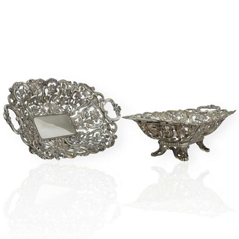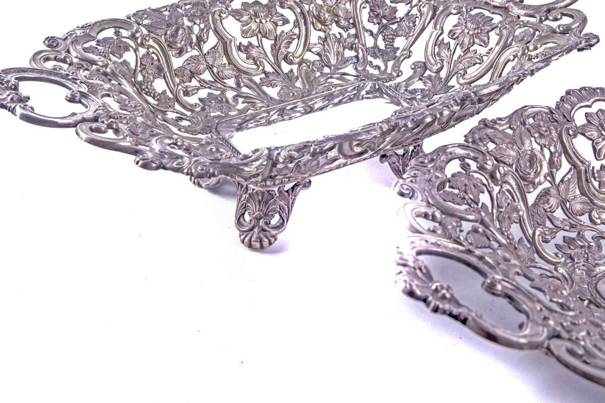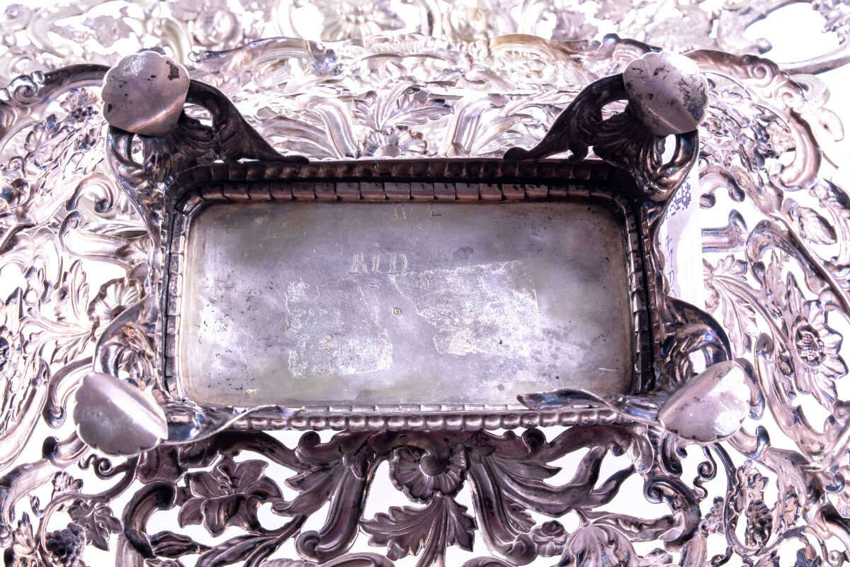 2 pieces, Germany, 19th century, fineness 13-solder silver hallmarked (810), maker's mark, rectangular openwork basket with side handles, relief flowers, leaves and grape vines, height 29.4 cm, hollow, total weight approx. 746 g, repairs and signs of wear