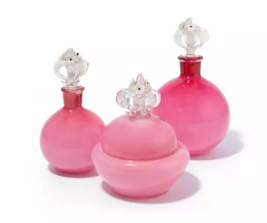 Entwurf um 1950. 3-teilig, 2 Flakons und Dose. Farbloses Glas, himbeerfarben und opakweiss unterfangen. Knäufe aus farblosem Glas mit applizierten, weissen Blüten. Flakons mit Resten eines Papieretiketts, Dose im Stand signiert "venini murano ITALIA" (Ätzstempel, 3-zeilig). H 11.5–15,5 cm.