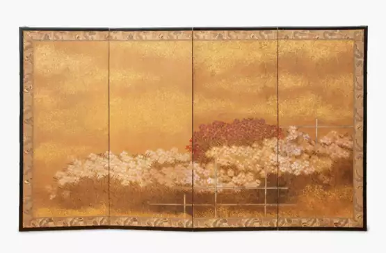 Japan, 19.Jh. Tusche und Farbe auf Papier. Vierflügeliger Byôbu. Feld voller blühenden Nadeshiko (Nelken) in Rot, Rosa und Weiss. 159x94,5 cm.