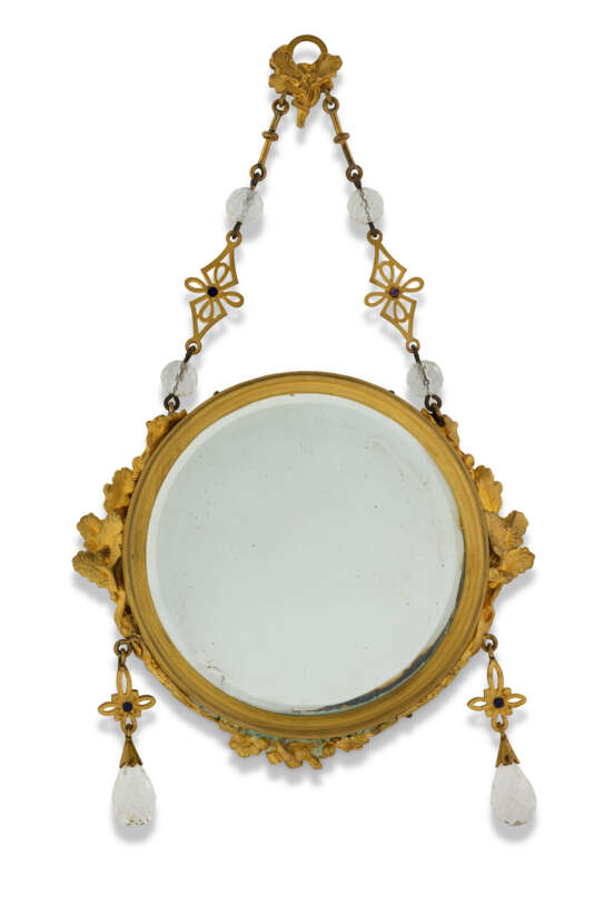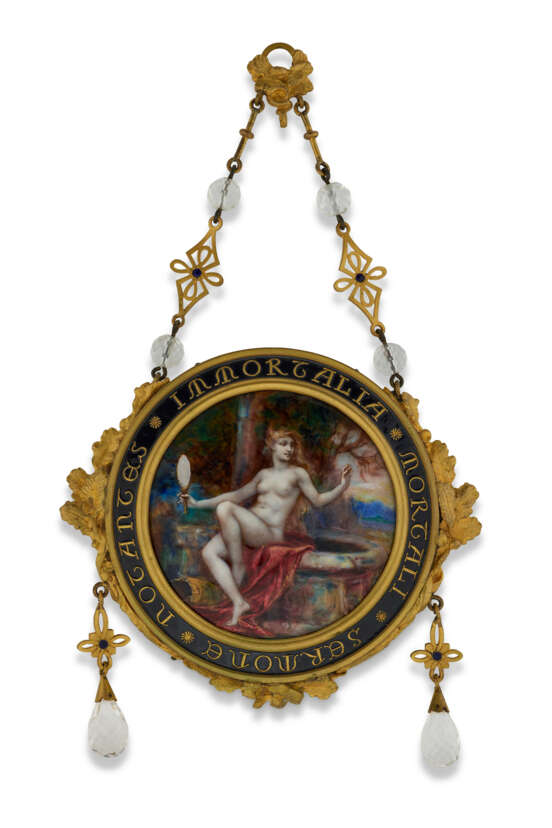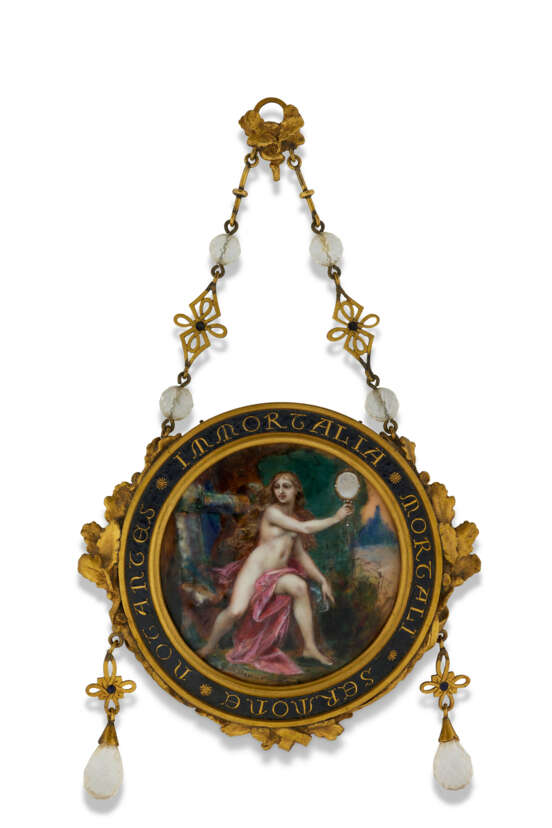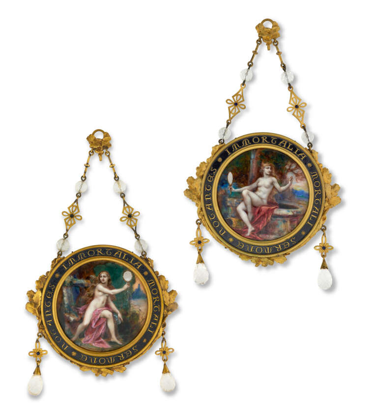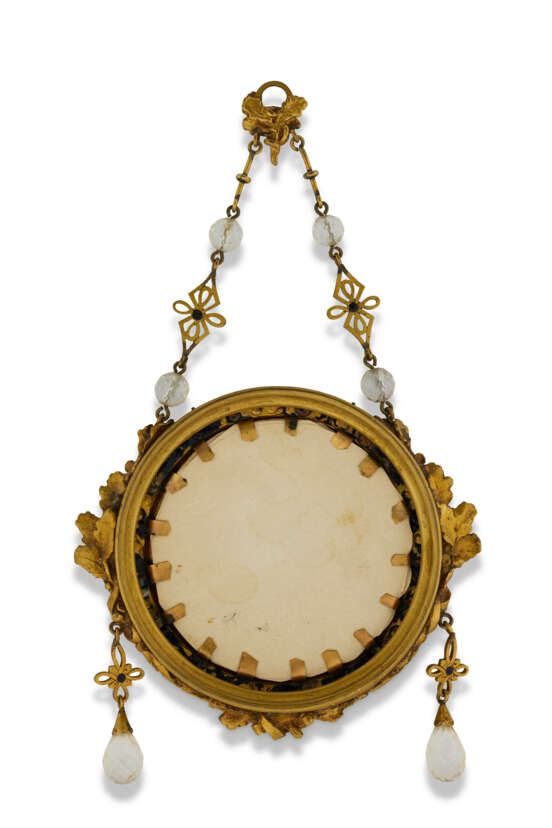 plaques circulaires en émail peint polychrome et rehauts d'or, signées 'Grandhomme', dans des cadres en bronze doré ornés de feuillages et pendeloques en cristal facetté, avec une inscription circulaire sur émail d'après Montaigne : 'Immortalia mortali sermone notantes' ; un miroir manquant