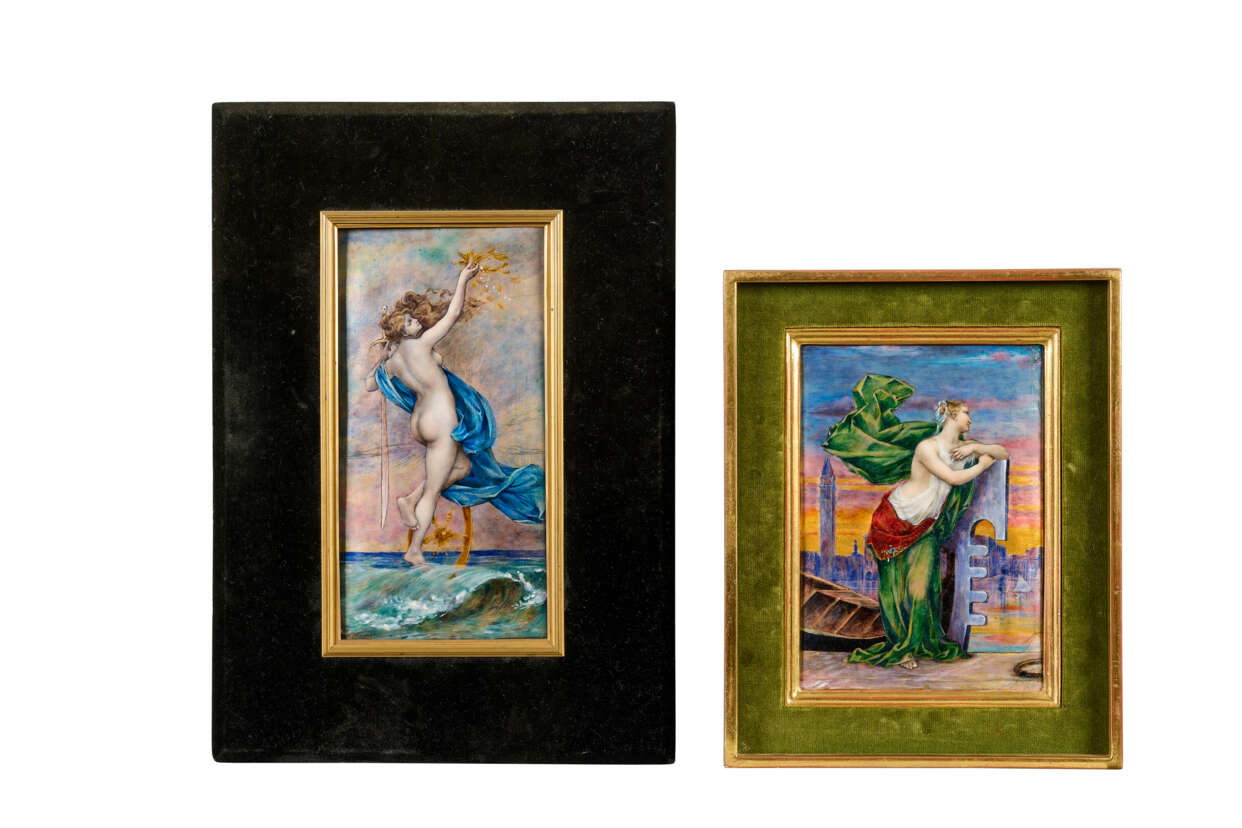 deux plaques rectangulaires en émail peint polychrome et paillons, rehauts d'or, La Fortune : signée 'Grandhomme. INV. PINX', Allégorie de Venise : signée 'P. Grandhomme. AGarnier. PINX' et au revers 'PGrandhomme AGarnier / Em... / L. Falize...', dans des cadres postérieurs en velours l'un noir et l'autre vert