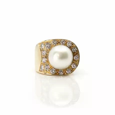 585 yellow gold, tested, South Sea cultured pearl Ø 1.3 cm, brilliant-cut diamonds, total approx. 1.29 ct, VSI, H, ring size 49, total weight approx. 28.8 g, accompanied by an expert appraisal from 2008 valued at 5,000 Euro