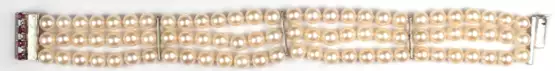 Lot 862 | Perlen-Armband, 3-reihig, 585er 5WG-Schließe mit 4 Rubinen besetzt, L. 19 cm, B. 1,9 cm