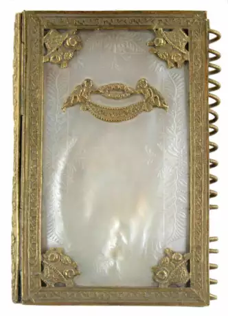 Sehr fein gearbeiteter, mit Palmblättern und Blüten ziselierter Perlmutteinband in reich mit Blüten und Rankenwerk verzierter Metallfassung, der Vorderdeckel mit zwei auf das Perlmutt aufgebrachten Putti mit dem Spruchband "Souvenir". - Das gefaltetete Kalenderblatt für das Jahr 1821 mit figürlicher Bordüre. Die Kalenderblätter unbeschrieben. - Der Seidenumschlag sowie die Seidenvorsätze der Einbanddecke mit Feuchtigkeitsfleck. Sonst sehr schön erhalten.