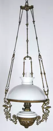 Lot 1041 | Petroleum-Hängelampe, um 1880, Messing, an Ketten und Stäben hängende reich verzierte Halterung für Schirm und Petroleumbehälter, komplett, H. 110 cm, Dm. 36 cm