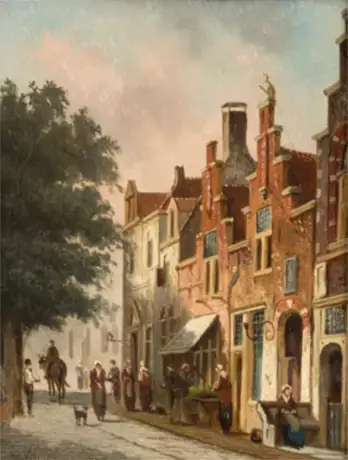 Dutch street scene, oil on wood, 27 x 20.5 cm object dimensions, signed, partially slightly retouched