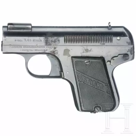 Kal. 7,65mmBrowning, Nr. 134704, nummerngleich. Fast blanker Lauf. Fünfschüssig. Kaiserlicher Beschuss und Abnahme Krone/got. Buchstabe. Links am Verschluss Kaliberangabe, am Rahmen Firmierung und Bayard-Logo, oben am Verschluss Patent. Originale Brünierung, stellenweise etwas feinnarbig, Tragespuren. Schwarze Hartgummigriffschalen mit "Bayard". Magazin mit beidseitig vier Sichtlöchern.