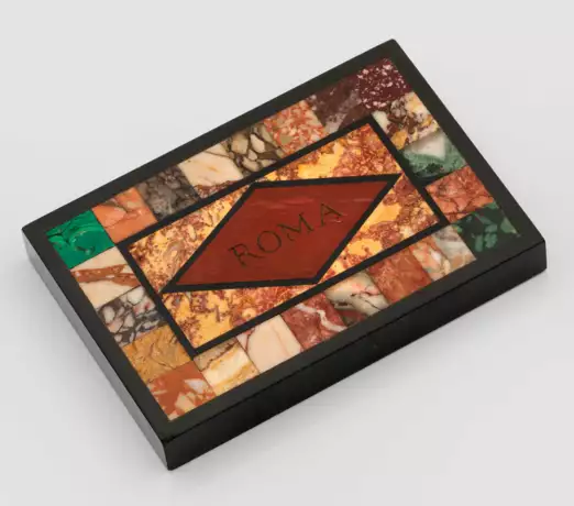 Marmor. In schwarzer Marmorrahmung verschiedene eingelegte Ornamente aus farblich unterschiedlichem Marmor. Mittig graviert "Roma". 8 cm x 12 cm.