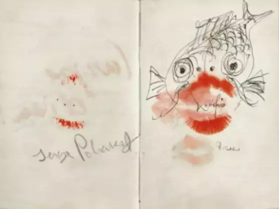 Birthday Guest Booklet. With numerous guest entries accompanied by small drawings and red kissing mouths. Including: pencil sketch "Madam" signed Poliakoff as well as small sketches by Fis (Hans Fischer).