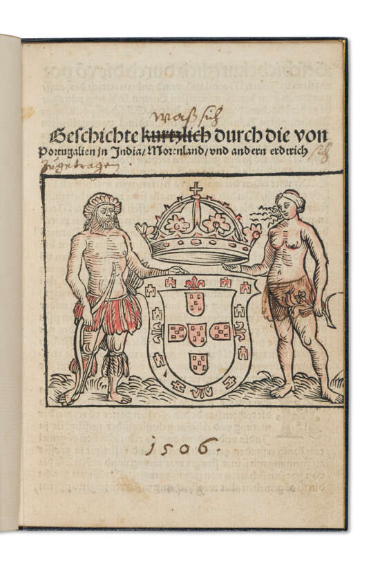 First[?] German edition, describing the first European colonizing campaign in India. Mindlin copy. This is a German translation of the account first published in November 1506 at Rome, see preceding lot. The introduction praises the Portuguese for bringing Christianity to heathen lands and states that the text was prepared by Pedro Alfonso Malheiro, Chaplain to the Cardinal Bishop of Oporto. The title page includes a striking woodcut, with early hand-coloring and an addition of a skirt to the nude female. Rare. Only five copies recorded in OCLC and none in the auction records of ABSA or RBH. VD16 ZV 12697.