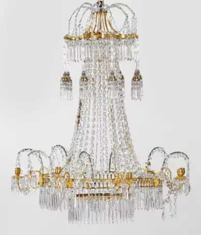 8-flg.; Bronze, feuervergoldet und farbloses böhmisches Kristallglas. Balusterförmiger Korpus aus Prismenschnüren im Verlauf. Durchbrochen gearbeiteter Reif mit reliefplastischen Maskarons. Davon ausgehend geschwungene Leuchterarme mit vasenförmigen Tülen über durchbrochen gearbeiteten Leuchterarmen. Oberhalb Bekrönung aus gebogten Streben sowie lange, nachräglich elektrifizierte Quasten als Träger für Leuchtmittel. Reicher Behang aus facettierten Prismenstäben. Rest.; 100 cm. D. 84 cm.