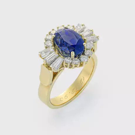 Gelbgold, gest. 750. Zentral besetzt mit einem unbehandelten Vivid Blue-Saphir von ca. 6,19 ct. im Ovalschliff, entouriert von Brillanten und Diamant-Trapezen von zus. ca. 1,50 ct. (F-G/vvs-vs). Gew. ca. 11,79 g.