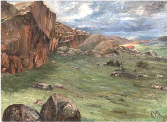 Lot 168 | Prytz, Olof August (1872 Göterborg- 1954 Göterborg) "Weite norddeutsche Landschaft mit Felsmassiv", Öl/ Lw., sign. u.r. und dat. 1900, rückseitig bez., 46x60,5 cm, Rahmen