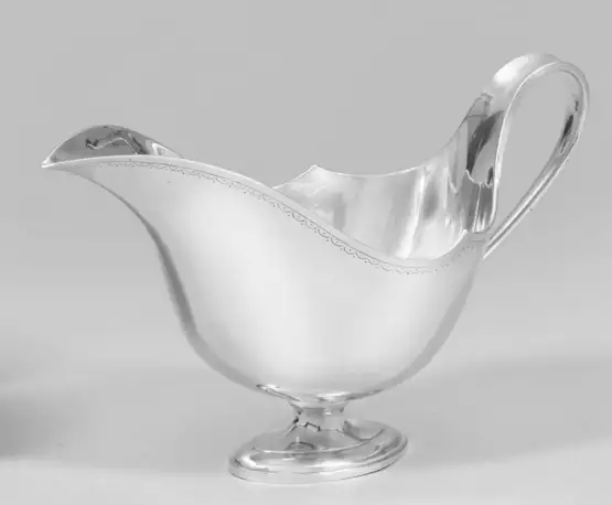 Silber. Zierlicher, mehrfach gestuft ansteigender Ovalstand mit kurzem Schaft, übergehend in tief gemuldeten, glatten Korpus. Der Rand passig geschweift und seitlich spitz zu einem Ausguss bzw. zu schmalem, gebogtem Henkel geformt. Unterhalb des Randes ein umlaufendes, zart graviertes Zierband. Am Stand monogr. "ET". Gest., Meister Pierre Collinet/Colinez (tätig seit 1770), französische Garantiemarken (1798-1838). Gew. ca. 300 g. H. 13 cm. 21,5 cm.
