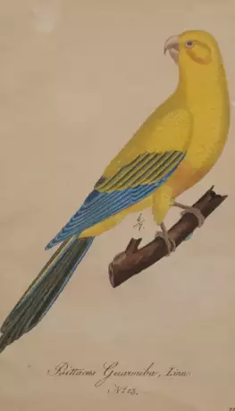 Lot 246 | "Goldsittich", kolorierte Grafik, bez. "no. 13", 18x11 cm, im Passepartout hinter Glas und Rahmen