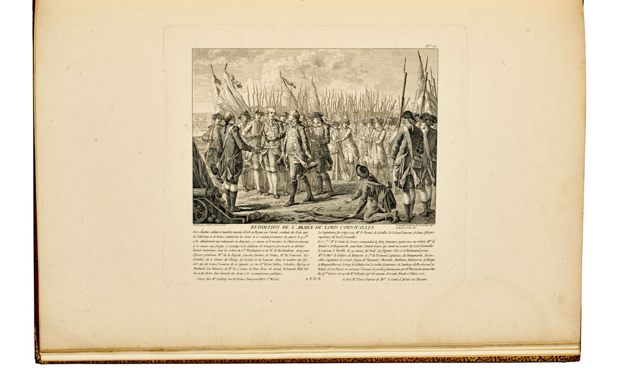First edition, with an autograph letter signed from John Burgoyne to Friedrich Reidesel, dated 9 November 1776. This rare suite illustrates the main events of the American Revolution through French eyes, including the tarring and feathering of British customs official John Malcolm, the Battle of Lexington, Burgoyne's surrender at Saratoga, the attack of French forces on the island of Dominica, the surrender of Senegal, the capture of Grenada, the capture of Pensacola, the capture of Tobago and the surrender of Cornwallis. Two maps show the newly-formed United States and four territories ceded by Britain to France after the war, and a series of vignettes commemorates the Treaty of Versailles in 1783. This edition is often cited as the first French book with a title-page mentioning the United States. Cohen de Ricci 862 (with erroneous collation); Howes C-576; Sabin 68421; Winsor VI, 185n.