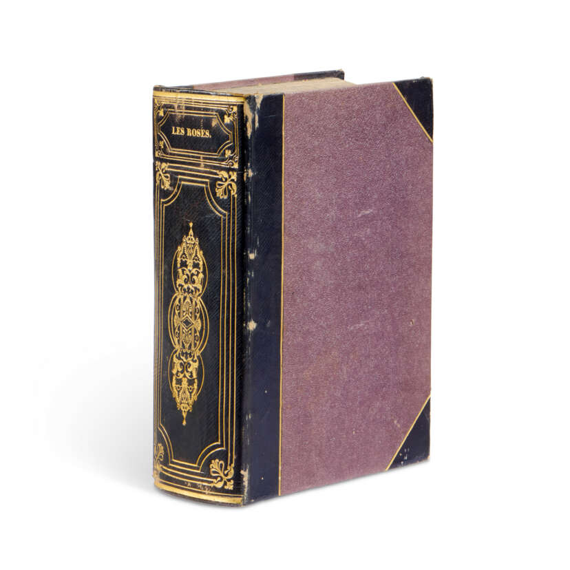40 parts in one volume, octavo (231 x 150mm). Letterpress title, half-title, 160 stipple-engraved plates, printed in colours and finished by hand, by Chardin, Langlois, Lemaire and others after Redouté, 4pp. prospectus at beginning and 8pp. contemporary manuscript index bound in at end (scattered spotting and browning throughout, plate 50 more heavily browned). 19th-century dark purple half morocco, flat spine with title at head within tooled gilt headpiece and the remainder of spine with large decorative gilt centrepiece composed of foliate and scroll tools with a border of arcs terminating in tiny trefoils within a border of four single filets with fleur-de-lys cornerpieces, marbled edges (extremities lightly rubbed, corners and joints slightly more heavily). Provenance: Marchesa Arconati (gift presentation inscription dated 1865 on front flyleaf to:) – G. Pasolini.