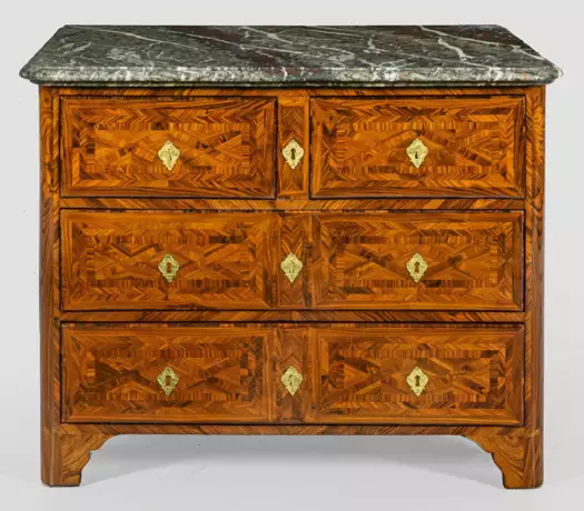 Palisander, furniert. Gerader, querrechteckig angelegter Korpus mit gerundeten Ecken auf korrespondierenden Füßen. In der gegliederten Front vier Schubladen unterschiedlicher Größe. Flächendeckend breit gerahmte Furnierfelder aus Gitterwerk, von Bandeinlagen begrenzt. Gering überstehende Deckplatte aus cremefarben, bordeauxrot, weiß und dunkelgrüngemasertem, sog. "Campan Grand Melange"- Marmor. Rest.; H. 80,5 cm. 100 cm x 60,5 cm.