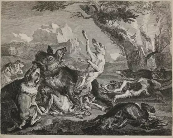 (1717 Stockholm 1793) Wildschweinjagd. Radierung nach A.Hondius, um 1750. Blattgr. 41 x 49 cm. - Oberer Rand 2 Einrisse (ca. 2,5 cm), ca. 1,5 cm in das Bild hinein.