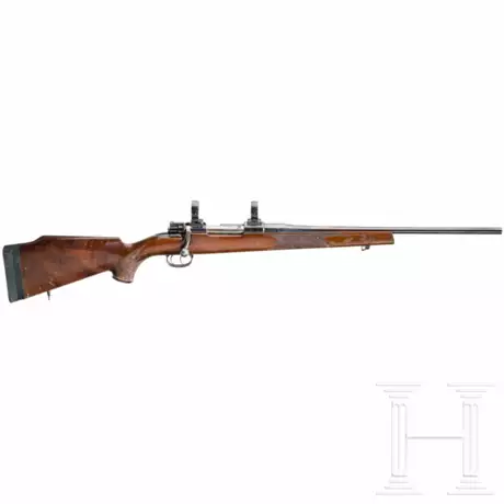 Kal. 7x64, Nr. 140761, blanker Lauf, reinigungsbedürftig. Länge 53 cm. Ohne offene Visierung. Fünfschüssig. 98er System. Verschlusszylinder blank, restliche Metallteile brüniert. Seitliche Schiebesicherung. Deutscher Stecher. Dunkler Nussholzschaft mit deutlichen Gebrauchsspuren, Pistolengriff, Fischhaut und langezogener Backe mit Monte-Carlo-Effekt. Schaftverlängerung mittels Gummieinlage und breiter Schaftkappe. Abstand vorderer Abzug bis Schaftkappe 38 cm. Riemenbügel. Montiert Schwenkmontage mit Unterbau und Ringen (25,4 mm). Gesamtlänge 106 cm.