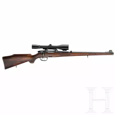 Kal. .222RemMag, Nr. 13932, blanker Lauf, Länge 50 cm. Standvisier mit Perlkorn und Korntunnel. Lauf mit steyrtypischen Hämmerspuren auf der Aussenseite. Gültiger Beschuss. Zylinderverschluss mit sechs Verriegelungswarzen. Deutscher Stecher. Dunkler Nussholzschaft mit schottischer Fischhaut, Pistolengriff und langgezogener deutscher Backe. Gummischaftkappe mit Steyr-Logo. Montiert mittels Steyr-Schwenkmontage ein ZF Hubertus 6 x 42, Abs. 1. Riemenbügel. Länge 98 cm.