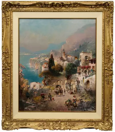 Duftig-locker in pastellartig-rötlichen Grundtönen gehaltene Landschaft im impressionistischen Stil. Während der Vordergrund mit dem regen Treiben auf einer Uferstraße nahe bei einer Stadt ein pittoreskes und buntes Stimmungsbild eröffnet, löst sich der Hintergrund in dunstiger Ferne auf. Stiltypisches Werk des bekannten österreichischen Malers, der zahlreiche Länder der Mittelmeerküste bereiste und hauptsächlich in südliche Atmosphäre getauchte Italien-Veduten schuf. Öl/Lwd.; R. u. sign.; 69 cm x 55 cm. Rahmen.