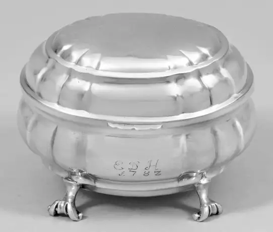 Silber. Auf vier eingerollten Füßen ovaler, bauchiger Korpus mit senkrechten, dreifachen Zügen. Scharnierter Deckel mit korrespondierendem Dekor. Schauseitig monogr. "E. D. H." und dat. 1782. Minim. rest.; Gest. Tremolierstich, Beschauzeichen, nicht identifiziertes Meisterzeichen "FLVR". Gew. ca. 165 g. H. 7,5 cm. 10,5 cm x 9 cm.