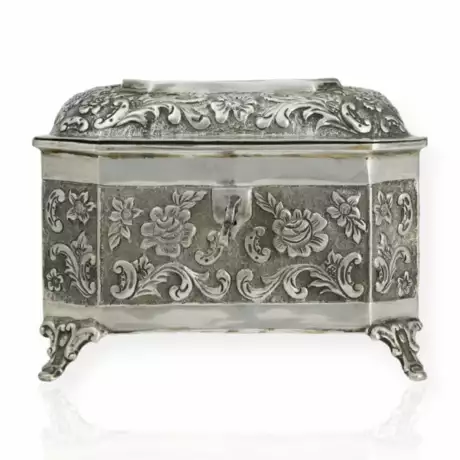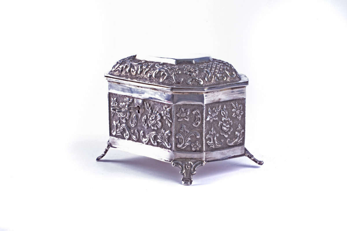 Germany, city mark Danzig, maker's mark, 18th century, fineness 13-alloy silver hallmarked (810), hallmarked, placed on four feet, chest-shaped box with hinged lid, relief decoration on the sides and lid consisting of flowers, curved leaves and Rococo latticework, gilded interior, height 13 cm, width 16 cm, depth 11 cm, key and lock probably replaced, total weight approx. 630 g, signs of wear