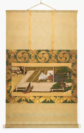 Japan, Edo-Zeit. Farbe, Goldfolie und Tusche auf Papier. Darstellung von Adligen am Hof. Teil eines Makimono, aufgezogen. Bildgrösse 28x60,5 cm. 73x117 cm. Beigegeben: 1 Paar Fûchin-Gewicht aus Stein.