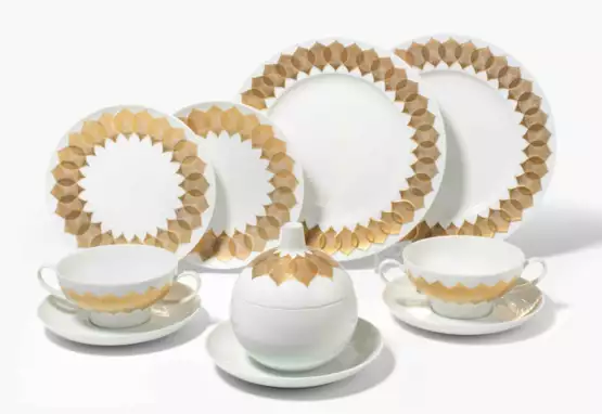 Ausformung seit 1968. Studio-Linie. Entwurf: Björn Wiinblad. Porzellan. Reliefdekor mit Vergoldung. Bestand: 12 Suppentassen mit Untertassen, 12 Fleischteller (D 25 cm), 12 Salat/Dessertteller (D 19 cm), 1 Saucière, 12 Teetassen mit Untertassen (H 5 cm, 2 Sets davon ohne Golddekor). Total 49 Teile.