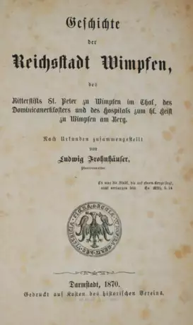 Heyd II, 5079-a. - Etw. fleckig. - ╔Dabei: Frohnhäuser,L.╗ Geschichte der Reichsstadt Wimpfen,... Darmstadt 1870.