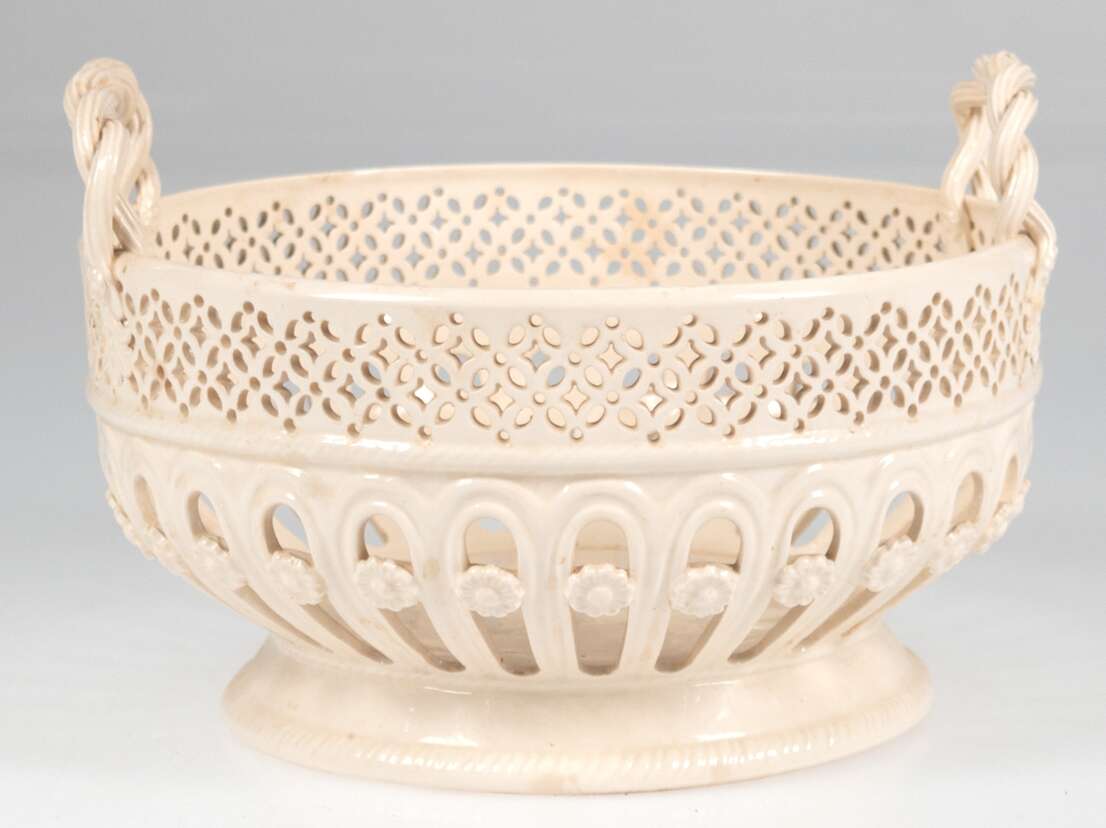 Lot 434 | Royal-Creamware, Korbschale, rund, England, Fayence, beige glasiert, durchbrochene Wandung mit Blütendekor, Rand mit 3 gedrehten Henkeln, 2 Haarrisse, H. 16 cm, Dm. 23 cm