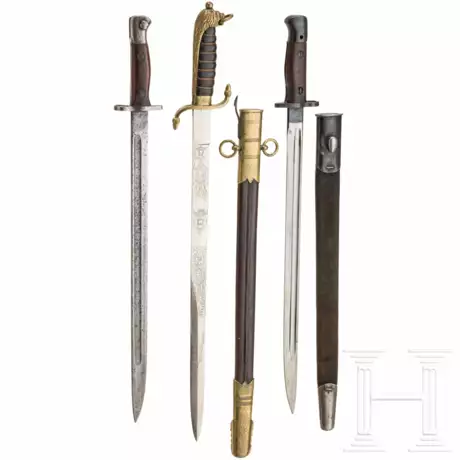 Beidseitig reich geätzte, vernickelte Keilklinge mit Mittelspitze, ohne Hersteller, Messinggefäß mit Ankersymbol und Löwenkopfknauf, braun belederter Griff mit Drahtwicklung, braune Lederscheide, Messingbeschläge. Dazu zwei Bajonette P 07, davon eines narbig und ohne Scheide. Gebrauchs- und Altersspuren. Länge 54 - 62,5 cm.