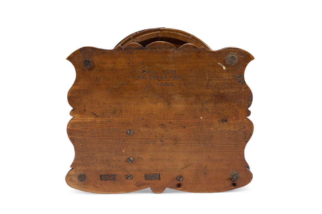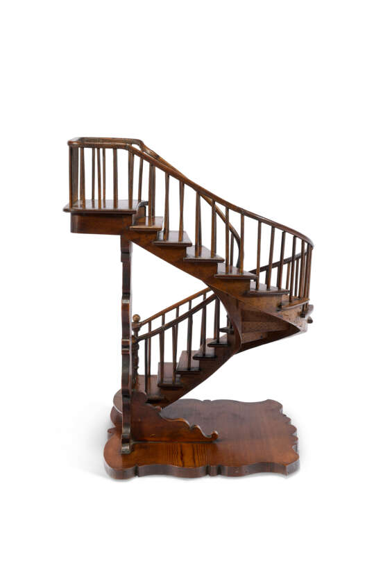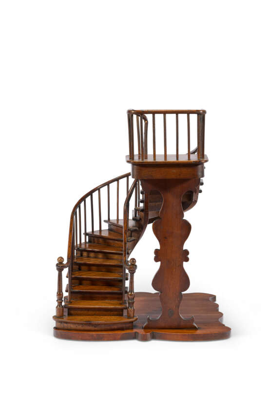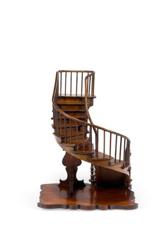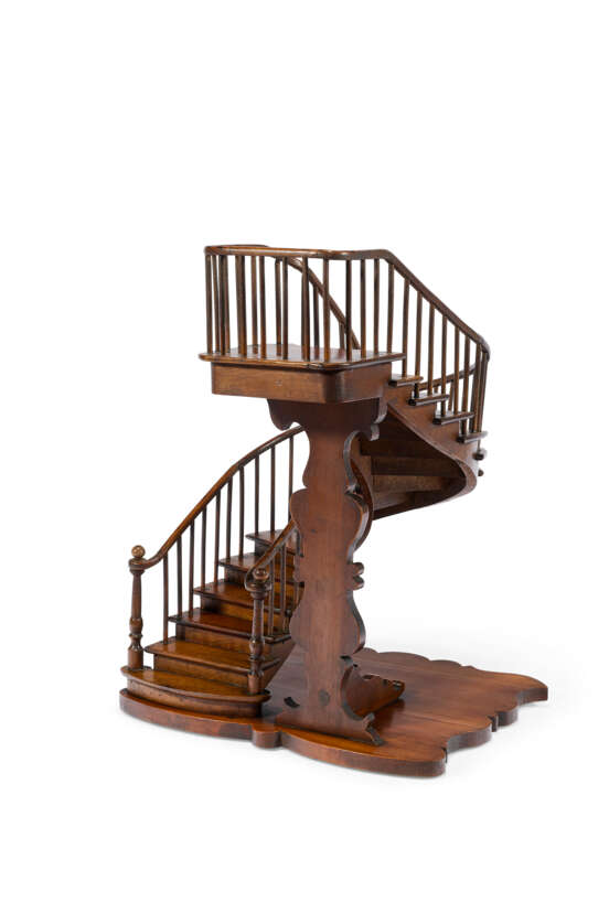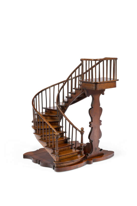 noyer et pin, débutant par une marche ovale débordante portant deux piliers de départ tournés et couronnés, une double rambarde décorée de balustres et d'une main courante au départ en croche filant jusqu'à une plateforme d'arrivée encadrée et soutenue par une colonne d'appui sculptée, estampillé sous la terrasse mouvementée 'Paris 1889 / R.T SCHLEGEL' et 'C.C.D.D.' (pour Compagnon Charpentier Du Devoir) et marqué des trois points du compagnonnage ; on y joint la médaille décernée au compagnon lors de l'Exposition universelle de 1889