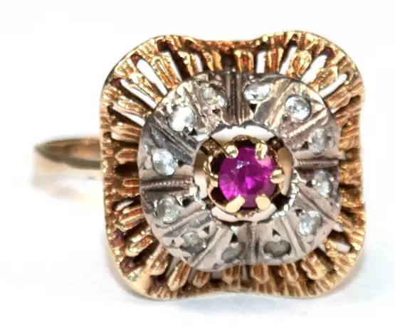 Lot 867 | Rubin-Saphir-Ring, 14 k GG/WG, kissenförmiger Ringkopf besetzt mit 1 rund facettierten Rubin und 12 weißen Saphiren, Ges.-Gew. 5,28 g, RG 61
