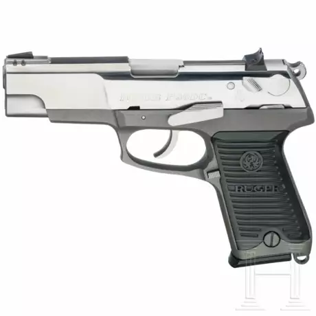 Cal. .45Auto, SN. 660-15113, blanker, schwerer Lauf, Länge 4-1/2". Achtschüssig. Dt. Beschuss 96. Dreipunkt-Visierung. Schlittenfertigung in Stainless. Griffstück in Graublau. Rechts die Firmierung und links die Gemarkung "RUGER / P90DC". Schwarze Kunststoffgriffschalen mit Firmenlogo. Magazin. Fangring. Fast neue Erhaltung.