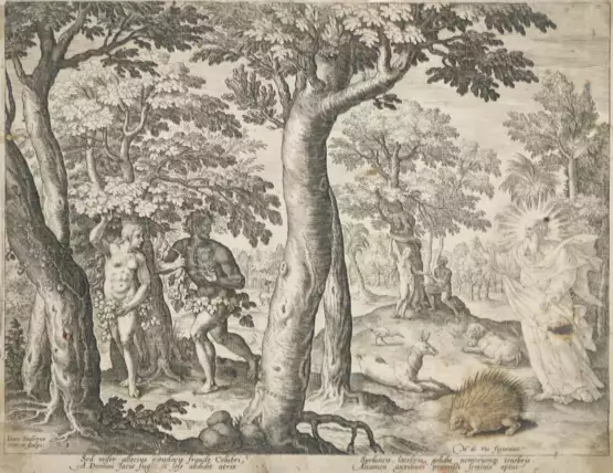 (1550 Antwerpen - München 1608). Adam und Eva verstecken sich vor Gott nach de Vos. Radierung. Bildgr. ca. 19,3 x 27,5 cm. Auf Papier aufgezogen.