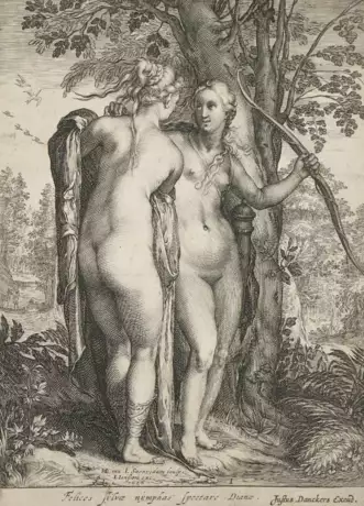 (1565 Saenredam - Assendelft 1607). Felices sylvae nyhmphas spectare Dianae. Radierung n. Goltzius bei Janßon 1626. Plgr. 20,8 x 15,7 cm. - Bis zum Rand beschn.